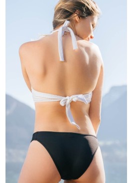 Haut de maillot triangle blanc bande noire entière doublé, à motifs, avec liens à nouer autour du cou et dans le dos.